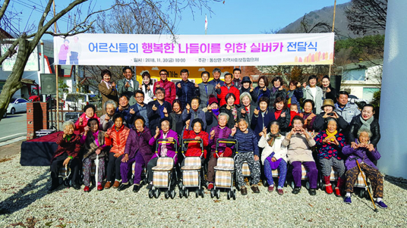 | 지난달 30일 완주군 동산면에 실버카를 전달한 동산면 지역사회보장협의체 회원들과 지역 내 어르신들이 포즈를 취하고 있다. | |