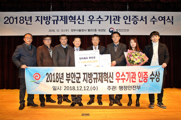 | 부안군은 올해 처음으로 행정안전부에서 주관하는 2018 지방규제혁신 우수기관 인증 지자체로 선정돼 12일 서울정부청사 별관2층 대강당에서 인증서를 수상하는 영예를 안았다.