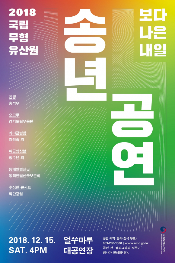 | 문화재청 국립무형유산원(원장 조현중)은 오는 15일 오후 4시 국립무형유산원 얼쑤마루 공연장에서 ‘2018년 송년공연’을 개최한다.