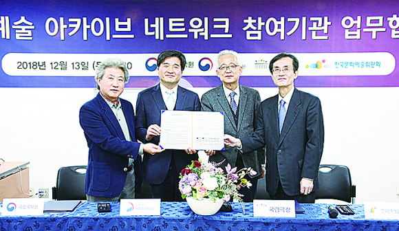 | 문화재청 국립무형유산원(원장 조현중)은 국립국악원(원장 임재원), 국립중앙극장(극장장 김철호), 한국문화예술위원회(위원장 박종관)와 함께 13일 서울 국립국악원에서 업무협약을 체결했다. 이번 협약은 공연예술 아카이브를 운영하고 있는 기관 간 상호 협력관계를 구축하고 아카이브의 보존?이용 활성화를 위한 교류?협력을 강화하기 위해 마련됐다. 협약의 주요 내용은 ▲ 공연예술 아카이브의 발전을 위한 정책개발과 학술연구 등 협력, ▲ 아카이브 대국민 서비스의 원활한 운영과 확대, ▲ 공공의 이익에 부합하는 아카이브 운영을 위한 법 제도적 개선에 대한공동 노력 등이다.
