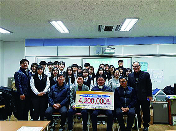 | 13일 임실고 제7회 장학회 졸업생 모임이 후배들의 면학을 위해 써달라며 총 420만원의 장학금을 전달한 후 후배들과 함께 기념 촬영을 하고 있다. |
