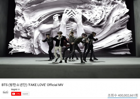 그룹 '방탄소년단'(BTS)의 '페이크 러브' 뮤직비디오가 조회수 4억뷰를 돌파했다.