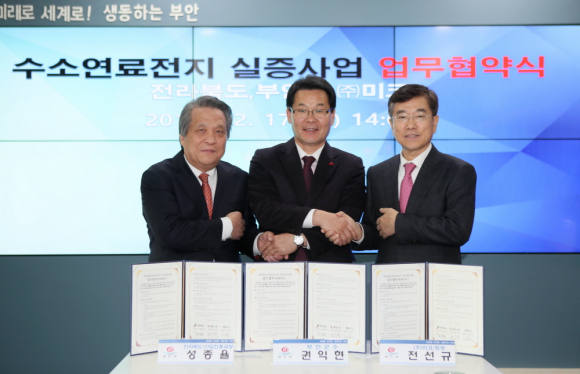 | 부안군이 수소산업 육성을 추진하고 있는 가운데 17일 군청 회의실에서 전북도와 (주)미코 등과 고체산화물 연료전지(이하 SOFC) 실증사업을 위한 업무협약을 체결했다. 이날 협약식에는 권익현 부안군수와 성종율 전북도 산업진흥과장, 전선규 미코 회장 등이 참석했다. 이번 협약은 지난 8월 정부의 혁신성장 3대 전략투자 분야로 선정된 수소경제를 부안군의 미래먹거리 및 성장동력으로 발전시키기 위한 부안군의 야심찬 첫 포석이다.