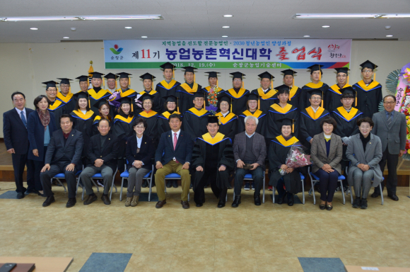 | 순창군이 지난 19일 전문농업인반과 2030청년농업인반 등 농촌혁신대학 2개 과정 졸업식을 가졌다. 졸업생 31명은 지난 3월에 입학해 유명강사를 초빙한 33개 강좌의 집합교육과 국내 선진농업 현장견학 5개 강좌 등 총 38강좌를 수강했다. 강좌는 농산물 마케팅과 친환경농업, 농가 경영개선 등을 중심으로, 농촌체험과 리더십 등 농업의 다차산업화를 촉진할 수 있는 전문농업인의 능력과 자질을 향상시키는 데 초점을 맞췄다. 이날 졸업식에는 박영종(복흥면)씨가 자치활동에 기여한 공로로 농촌진흥청장 표창을 받았고, 김병진(순창읍)씨 등 5명이 군수 표창패와 공로상을 수상하는 영예를 안았다. 11기 졸업생인 태원애(58·순창읍)씨는 “농업농촌 혁신대학을 통해 급변하는 농업환경을 파악하고 또 이에 대처할 수 있는 안목을 기를 수 있는 기회가 됐다”며 “앞으로 혁신대학에서 배운 내용을 바탕으로 농업환경에서 경쟁력을 키울 자신이 생겼다”고 소감을 밝혔다. 이날 참석한 황숙주 군수는 “1년간의 혁신대학 수강이 정예핵심리더로 성장할 수 있는 좋은 영양분이 됐길 바란다”며 “앞으로도 4차 산업혁명에 대응하는 능력을 갖추고 순창군 농업이 한 단계 성장할 수 있도록 최선의 노력을 해주길 희망한다”고 졸업생들을 격려했다. 한편 농업기술센터는 올해까지 혁신대학 졸업생 417명을 배출하며 순창 지역농업을 이끌어 가는 리더 양성에 큰 몫을 하는 만큼, 앞으로도 순창지역에 맞는 프로그램을 운영하는 등 교육의 다변화를 추진할 방침이라고 밝혔다. |