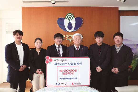 | 26일 무주군을 찾아 수확물로 얻은 수익금 일부 100만원을 기탁한 무주군청년농업인(4-H) 회원들과 황인홍 무주군수가 기념 촬영을 하고 있다. | 무주군청년농업인(4-H)회가 26일 무주군을 찾아 이웃돕기 성금 100만원을 기탁했다. 성금은 회원들이 과제실습을 위해 운영 중인 시험포에서 나온 수익금으로 알려져 의미를 더했다. 무주군청년농업인(4-H)회 최주형 회장은 “새로운 영농기술을 습득하고 농작물 재배룰 통해 경험을 쌓은 동시에 수확물로 얻은 수익금은 지역의 어려운 이웃들을 위해 쓰게 돼 보람을 느낀다”고 말했다. 한편 크리스마스를 하루 앞 둔 지난 24일에는 적상중학교 학생들이 케이크 50개(100만원 상당)를 직접 만들어 적상면 주민자치센터에 전달했다. 학생들은 “모두가 크리스마스라고 즐거워하는데 형편이 어려워 엄두를 못내는 이웃들이 있다는 게 속상했다”며 “우리가 직접 만든 거라 파는 케잌처럼 예쁘거나 완벽하진 않지만 따뜻한 마음이 담겨 맛있을 것만은 자신한다”고 전했다. 무주군청년농업인회에서 기탁한 성금은 전북사회복지공동모금회를 통해 저소득 계층에게 전달될 예정이며 케잌은 적상면 주민자치센터를 통해 지역 내 어려운 이웃들에게 전달됐다.