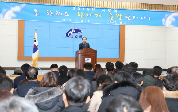 | 2019년 기해년 새해를 맞아 2일 군청 강당에서 이항로 군수를 비롯해 200여명의 공직자가 참석한 가운데 2019년 시무식을 갖고 새해 첫 업무를 시작했다. 이항로 진안군수는 신년사를 통해 “군민 삶의 질 향상과 미래희망 진안 실현을 위해 도전과 열정을 다한 공직자의 노고를 격려하고 새해 희망찬 미래를 향해 힘차게 출발하자”고 밝혔다. 이어 “아무리 어렵고 힘든 일이라도 포기하지 않고 확신을 가지고 노력하면 성공을 이룬다는 ‘유지경성(有志竟成)’의 뜻을 품고 자랑스러운 진안 건설에 공직자 모두가 힘을 합쳐줄 것”을 당부했다. 시무식에 앞서 이항로 군수와 간부공무원, 도의원, 군의원 등 30여 명은 유공탑 및 충혼탑에 들러 헌화와 분향, 묵념 등 참배를 했다. |