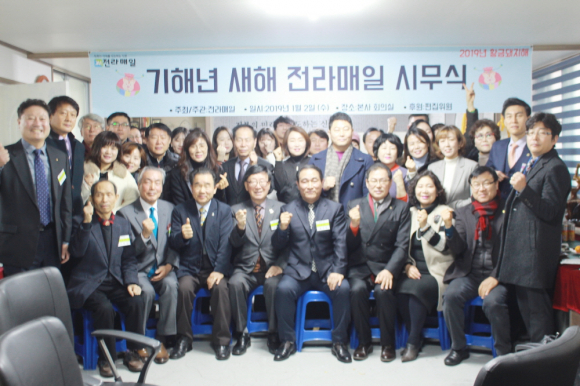 2일 2019년 황금돼지해를 맞이하며 전라매일 본사회의실에서 시무식이 열린 가운데 본지 홍성일 회장, 유현상 상임고문, 라혁일 고문, 홍의환 논설실장, 이계순 편집위원장, 박성래 전주시중소기업인협회 회장, 임규철 전주시 직능단체회장, 이용선 전국 체육위원, 백정신 국악협회장, 전석진 온누리안은행 대표, 임직원 등이 화이팅을 외치며 기념 촬영을 하고 있다.