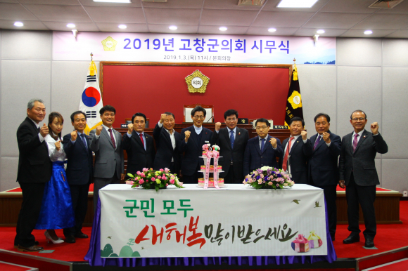 | 고창군의회(의장 조규철)는 3일 본회의장에서 조규철 의장, 유기상 군수, 군의원, 사무과 직원 50여 명이 참석한 가운데 희망찬 새해를 다짐하는 2019년 시무식을 개최했다. 이날 시무식은 조규철 의장의 신년사, 유기상 군수의 덕담, 케이크 커팅 등의 순서로 진행됐다.