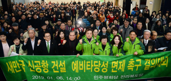 새만금 신공항 건설 예비타당성 면제 촉구 결의대회가 6일 전북 전주시 노블레스 웨딩홀에서 실시된 가운데 정동영 민주평화당 당대표와 민주평화당 전북도당 관계자들이 구호를 외치고 있다.
