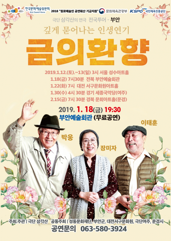 | 원로예술인 공연확산 기금지원사업으로 추진하고 있는 야심찬 기획공연 극단 삼각산(대표 장미자)의 연극 ‘금의환향’이 오는 18일 오후 7시 30분 부안예술회관 2층 공연장에서 펼쳐진다. 극단 삼각산의 이번 공연(강석호 작, 윤우영 연출)은 한국문화예술위원회의 원로예술인 확산 지원사업 수행처로 선정돼 전국 5개 지역 투어를 앞두고 있다.