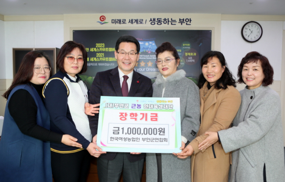 | 11일 부안군 근농인재육성재단에 장학금 100만원을 기탁한 한국여성농업인 부안군연합회가 권익현 부안 군수와 기념 촬영을 하고 있다. | 한국여성농업인 부안군연합회(회장 전삼례)는 11일 부안군 근농인재육성재단에 부안의 희망찬 미래를 기대하며 장학금 100만원을 기탁했다.