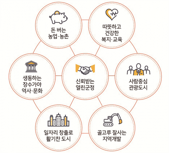 골고루 잘사는 지역개발 군민 모두가 골고루 잘사는 군을 만들기 위해 장수레트푸드 융복합 센터 조성과 지역행복 생활권 연계협력사업 등 지역개발사업을 추진하고 예비 장수 마을 등 역사·문화가 반영된 도시재생사업을 진행한다. 오지마을 행복택시 읍·면18개 마을, 수요 응답형 행복버스 확대 운영, 장애인 콜택시 지원, 중·고등학생 통학택시지원으로 교통 약자 이동수단 확충과 더불어 수요자 중심교통 체계를 구축한다. 이밖에도 천천~장수IC연결도로 개설, 장수~임실간 국도 13호선 건설, 장계 복합문화센터 군 계획시설 도로개설, 면 단위 LPG배관망 구축, 마을회관 신재생 에너지 보급, 교통안전시설 설치 및 관리, 전라북도 소방안전타운 공공기관 조성 등 SOS확충으로 지역 경쟁력을 강화해 나간다.