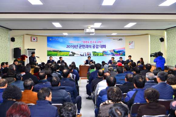 민선 7기 출범 후 처음으로 진행된 14개 읍·면 순회 공감대화는 인문학 도시에 걸맞게 시낭송으로 열어 분위기를 부드럽게 했고, 자랑스런 주민에 대한 시상, 퇴직이장 공로패 수여, 2019년 주요 업무보고, 군정 질의답변 순으로 진행됐다. 이번 공감대화는 소규모 사업성 건의 위주로 진행되던 기존의 운영방식에서 벗어나 군민 누구나 참여할 수 있는 격의 없는 대화로 진행돼 큰 호응을 얻었다. 현장에서 남녀노소 주민 누구나 군정 발전방향과 정책제시, 행정에 대해 궁금한 점을 질문했고, 유 군수가 직접 답변에 나섰다.