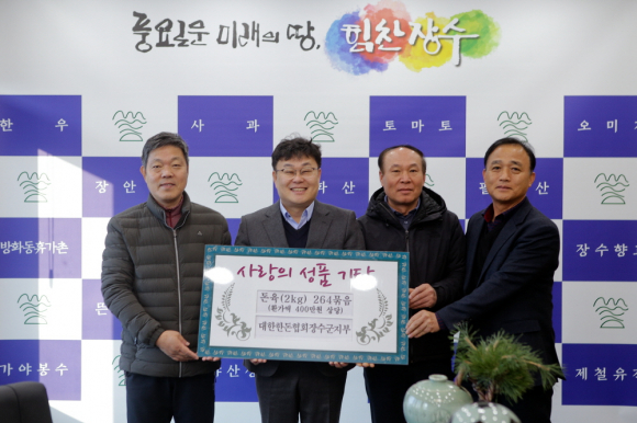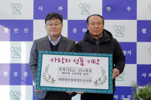| 대한한돈협회장수군지부는(지부장 유진성) 18일 설 명절을 맞아 돈육(2kg) 264묶음(환가액 4백만원)을 장수군에 기탁했다.