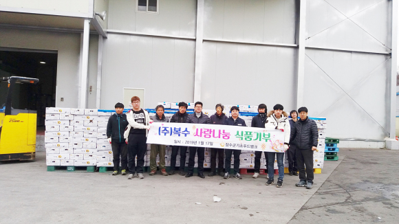 ㈜복수는 ‘기부자에게 나누는 기쁨을 이용자에게 내일의 희망과 행복을’이라는 슬로건으로 지난 2013년부터 매년 사랑나눔 식품을 푸드뱅크를 통해 기부해 나눔 문화 확산에 기여하며 기업 윤리의식을 실천해 모범이 되고 있다.