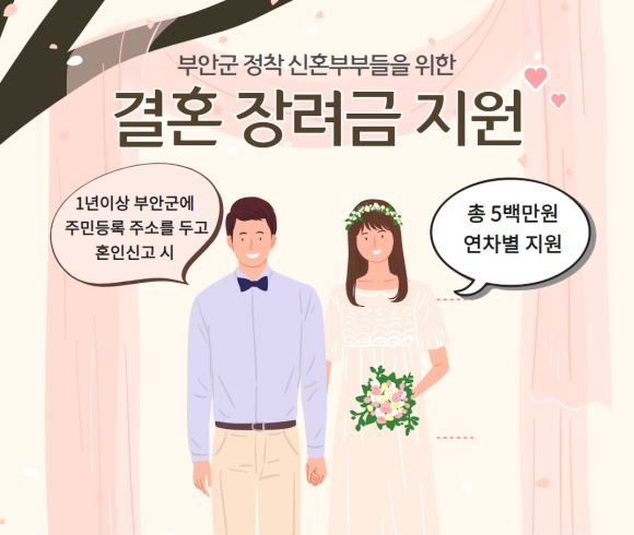 | 부안군은 신혼부부의 안정적인 결혼생활 정착에 도움을 주기 위해 결혼장려금 500만원을 지원한다고 밝혔다. 관련 조례를 개정해 지난 17일자로 공포하고 시행에 들어감에 따라 결혼장려금 지원대상은 조례가 공포된 이후 혼인신고를 한 부부부터 결혼장려금 지원을 받을 수 있다.