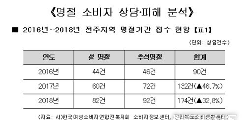 소비자정보센터 관계자는 "각종 생필품부터 명절선물세트 등을 전자상거래로 구매하는 소비자들이 증가함에 따라 배송전쟁이 벌어질 것으로 우려된다"면서 "운송 중 파손, 분실, 배송지연 등에 따른 피해가 발생한 경우 즉시 사업자에게 통보하고 해결되지 않으면 피해구제 핫라인으로 신고해달라"고 말했다. 한편 소비자정보센터에 따르면 2016년부터 3년간 설 명절기간 동안 전주지역에서 발생한 소비자 피해 접수는 총 186건에 달한다. |