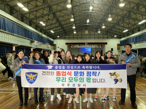 무주경찰서(서장 윤중섭)는 관내 초·중·고교 졸업식을 맞아 20개 학교에서 ‘강압적 졸업식 뒤풀이 예방활동’을 전개하고 있다.