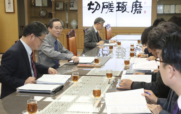 | ↑↑ 21일 도청 접견실에서 송하진 도지사 주재로 실국장들이 참석한 가운데 2020년 신규사업 3차 발굴 및 국가예산 전략 보고회를 개최하고 국가예산 확보 대응방안을 모색하고 있다. |