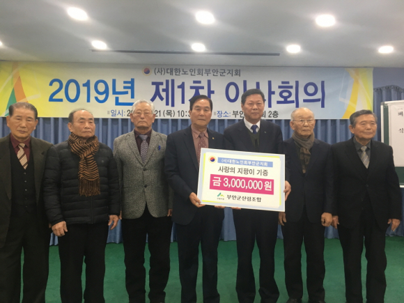| 부안군산림조합(조합장 오세준)이 원로 하신 노인 어르신들에게 사랑의 지팡이를 기증, 훈훈한 감동을 주고 있다. 부안군산림조합은 21일 개최된 대한노인회 이사회에서 지팡이를 구입 할 수 있는 3백만을 대한노인회 부안지부(지부회장 김종열)에 기증했다. <사진>