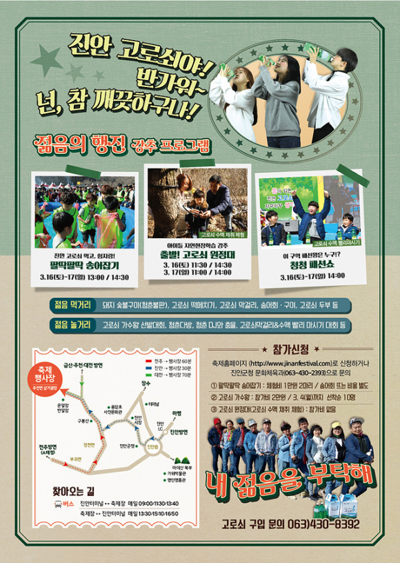 | ● 올해도 빠질 수 없는 ‘고로쇠 축제’ 1년에 단 한 번, 봄철에만 맛볼 수 있는 진안고원 고로쇠! 진안고원 고로쇠를 더 신선하고 재미있게 즐길 수 있는 제15회 진안고원 운장산 고로쇠축제가 진안군 주천면 운일암반일암 삼거광장에서 오는 3월 16일~17일 열린다. 운장산 고로쇠축제는 고로쇠원정대(건강걷기, 고로쇠채취체험), 팔딱팔딱 송어잡기, 청청패션쇼, 고로쇠 가수왕 선발대회, 고로쇠수액·막걸리 빨리 마시기 대회, 관광객 즉석 노래자랑 등 읍.면민과 관광객들이 참여할 수 있는 다양한 프로그램이 준비돼 있다. 또한 고로쇠 떡국, 청춘불판(돼지 숯불구이), 고로쇠 두부, 고로쇠 막걸리, 송어회&송어구이 등 이색 먹거리가 가득하다. 진안고로쇠 수액은 고원지대에서 자생하는 고로쇠나무에서 채취해 당도가 높고 칼륨, 마그네슘, 칼슘 등 무기성분이 많은 것이 특징이다. 구준히 먹으면 관절염과 골다공증에 좋으며 물보다 흡수가 빠르고 배설도 빠르기 때문에 신체정화에 좋은 효과가 있는 것으로 알려져 있다. 봄의 전령사라 불리며 달콤한 맛이 일품인 고로쇠 수액은 1년 중 2월에서 3월 사이 짧은 기간에만 만날 수 있기 때문에 매우 귀하다. 정제기를 통해 수확한 당일 정제하기 때문에 위생적이다. 실온에서 3-4일이 지나면 맛과 색이 변하기 때문에 냉장 보관하고 가급적 짧은 기간 내에 먹는 것이 좋다. 진안고원의 신선한 고로쇠 수액은 면사무소 산업담당을 통해 주문할 수 있다. |