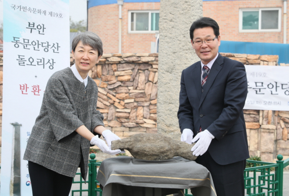 | 부안군은 5일 부안 동문안 당산 현장(동중리 2-3번지 일원)에서 16년전 도난당한 국가민속문화재 제19호 ‘부안 동문안 당산’ 돌오리상 1점을 문화재청(청장 정재숙)으로부터 반환받았다고 밝혔다. 문화재청은 부안군의 수사요청 후 관련 사건에 내사에 착수해 지난달 문화재를 회수했다고 밝혔다. 해당 문화재는 본래 전라북도 부안군 동중리 당산의 석주 위에 놓여있던 것으로 돌오리상을 절취한 절도범은 장물업자들에게 유통하려 시도했으나 지정된 문화재를 쉽게 유통할 수 없어 불상의 장소에 장기간 은닉 보관하고 있었다. 이 첩보를 입수한 문화재청에서 지속적으로 수사를 실시한 끝에 이번에 회수하는 성과를 거두게 되었다.