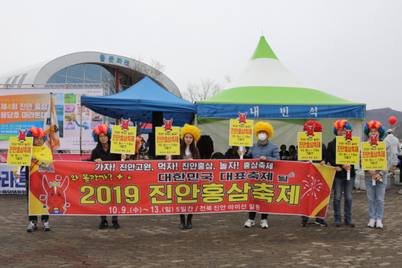 | 진안군 문화체육과(과장 양수현) 직원들이 지난 10일 진안군 용담댐 일원에서 개최된 제4회 진안홍삼 용담호 마라톤대회에서 ‘백세건강! 천년기운! 진안홍삼!’이라는 슬로건 아래 다양한 홍보활동을 펼쳤다. 진안홍삼축제는 2년 연속 20만 명 이상 관광객 방문, 높은 만족도 등 해를 거듭할수록 발전되고 있다는 평가를 받고 있다. 2년 연속 전라북도 우수축제 선정과 지난 2월 대한민국축제콘텐츠 경제부문 대상을 수상하기도 했다. 또한 최근 2019년 문화 관광육성축제로 선정되면서 짧은 기간 명실상부한 전북 대표 우수축제로 자리 잡았다. 군 관계자는 “진안홍삼축제를 통해 건강과 활력을 충전할 수 있도록 축제 준비와 홍보에 박차를 가하고 있다”며 “10월 9일부터 13일까지 5일간 열리는 진안홍삼축제에 많은 관심 가져달라”고 당부했다. |