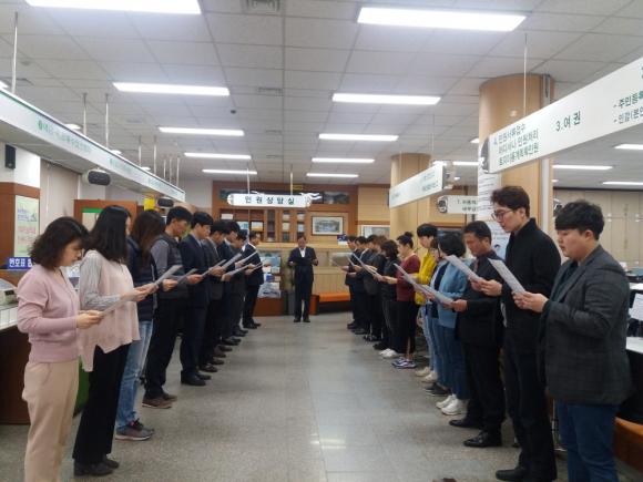 | ‘군민이 군수인 시대’를 표방하는 민선 7기 고창군의 대민 업무 친절도가 높아지고 있다. 15일 고창군 종합민원과에 따르면 매일 아침 군민이 감동하는 행정을 위한 ‘직원 친절다짐’으로 업무를 시작하고 있다. 친절다짐은 직원들 간의 밝은 목소리로 인사하는 것으로 시작해 민원서비스 헌장과 주민응대 언어를 낭독해 자기반성의 시간을 가지며, 간단한 체조와 건강박수, 구호제창으로 활기찬 분위기를 만들어 가고 있다. 또 어떠한 상황에서도 민원인을 내 부모 가족같이 편안하게 맞아, 쉽고 편안하게 설명할 수 있는 응대기법 향상교육 등이 진행되고 있다. 친절다짐에 참여한 직원들은 “처음 시작할 때는 많이 어색했지만, 업무시작 전 민원인을 대하는 태도를 연습하면서 마음가짐이 많이 달라졌다”며 “체조와 건강박수까지 같이 하다 보니 민원실이 더 활기차 진 것 같다”고 밝혔다. 고창군 김종훈 종합민원과장은 “방문하는 민원인들이 군청을 방문해 일을 보는 것이 쉽고 편안하게 느낄 수 있도록 군민의 눈높이에서 생각하고, 군민이 신뢰하고 공감하는 군민중심 행정을 펼치도록 노력 하겠다”고 말했다. |