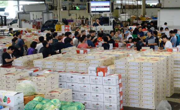 민족의 대명절인 추석을 10일 앞둔 3일 새벽 전북 전주시 덕진구 송천동 농수산도매시장에서 상인들이 추석 대목에 판매할 과일을 경매로 구매하기 위해 분주하게 움직이고 있다. <사진제공=뉴시스>