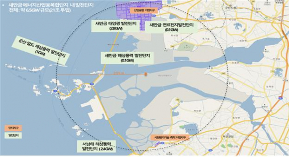 전북 새만금 일원 23.9㎢ 규모로 형성되는 새만금 에너지산업융복합단지는 대규모 재생에너지 발전단지를 활용해 연관기업, 실증·시험 설비 집적화하고 재생에너지 관련 연구기관 유치를 추진한다. 부안 신재생에너지 및 국내 최대 규모 재생에너지 발전단지를 앵커시설로 활용할 예정이다.