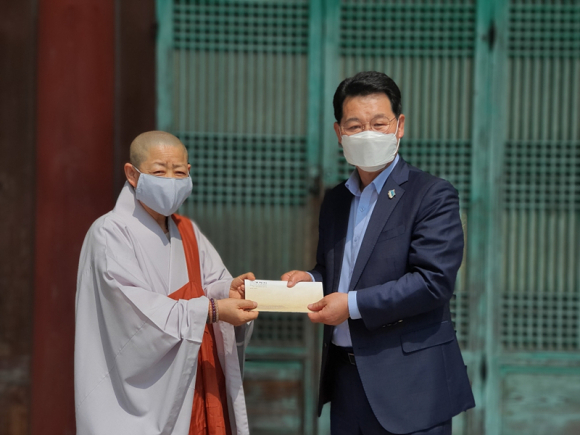 대한불교 조계종 24교구 선운사의 말사인 부안 혜원사의 정원스님은 코로나19로 어려움을 겪고 있는 이웃주민들을 위해 현장에서 재난지원금 100만원과 마스크 200장을 부안군수에게 전달했다.