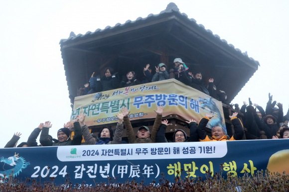 무주군은 ‘2024 갑진년 무주군 해맞이’ 행사를 지난 1일 무주읍 향로산 제1전망대에서 가졌다. <사진> 무주읍발전협의회가 주관한 이날 행사에는 황인홍 무주군수를 비롯한 관내 기관 · 사회단체를 비롯한 주민 등 3백여 명이 참석해 “힘찬 도약 무한한 번무주 번영”을 기원했다. 참석자들은 지역발전과 군민 행복을 기원하는 덕담을 나누고 ‘만세삼창’을 통해 좋은 기운을 돋우는 등 해맞이를 함께 했다. 황인홍 무주군수는 “청룡은 동쪽을 수호하는 신성한 동물로 창조와 생명, 신생을 의미한다”라며 “동부권인 무주에도 좋은 기운이 깃들길 바라는 마음 담아 새해 시작을 군민과 함께했다”라고 전했다. [주)전라매일신문=전라매일관리자기자] |