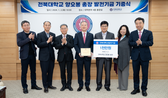 “갑진년(甲辰年), 여의주를 입에 물고 승천하는 청룡처럼 우리 전북대학교도 용비(龍飛)하는 한 해가 되길 바랍니다” 전북대학교 양오봉 총장이 2024년 새해 첫 날 대학의 더 큰 비상을 염원하는 1천만 원의 발전기금을 기부했다. 지난해 학생들을 위한 간식나눔 등 밀착형 복지를 위해 1천만 원을 기부한 뒤 연이은 기부다. 전북대 발전지원재단은 2일 오전 10시 대학본부 총장실에서 대학 주요 관계자 등이 참석한 가운데 발전기금 기증식을 갖고 양오봉 총장에게 감사패를 전달했다. 양 총장이 또 다시 1천만 원을 기부한 것은 올해 글로컬대학30 사업을 위해 학생 중심, 지역 상생, 글로벌 허브 대학으로 새롭게 비상하는 대학을 위해 총장이 솔선수범하겠다는 의미를 담았다. 특히 새해 첫 날 시무식사를 통해 올해를 학생 중심 대학으로 나아가는 원년으로 삼겠다고 선포한 양 총장은 이 기금을 학생들의 교육여건 개선과 밀착형 복지 증진을 위해 사용되길 희망했다. 양 총장은 “학생이 있어야 우리 전북대학교가 존재할 수 있다. ‘학생의, 학생에 의한, 학생을 위한 전북대학교’를 만들기 위해 총장이 앞장선다는 의미로 새해 첫 날 의미 있는 기부를 했다”며 “글로컬대학30 사업을 위한 담대한 여정에 나서는 우리 전북대학교에 혁신 동력이 되길 바란다”고 말했다. [주)전라매일신문=전라매일관리자기자] |