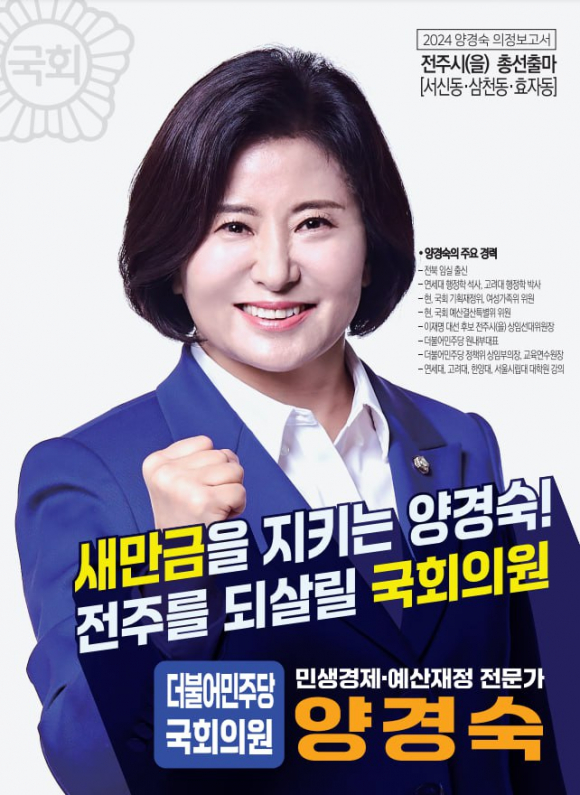 더불어민주당 양경숙 의원(기획재정위·예결위·여가위)이 새해를 맞아 2023년 의정활동 성과를 담은 온라인 의정보고서를 6일 배포했다. <사진> 양 의원의 의정보고서는 ‘새만금을 지키는 양경숙, 전주를 되살릴 국회의원’이라는 슬로건으로 국회 기획재정위원회 및 조세소위, 여성가족위원회 국정감사 등 상임위원회, 예산결산특별위원회, 입법활동, 전라북도의 주요 숙원사업 해결, 전주시(을) 예산확보 등 지난 1년간의 폭넓은 의정활동 내용을 상세하게 담아냈다. 의정보고서는 양경숙 의원이 새만금 잼버리 대회 파행 이후 윤석열 정부가 무더기 삭감한 새만금 SOC예산을 복원하고 전주시 국가예산 증액을 위해 앞장섰음을 강조했다. 국회단계에서 새만금 SOC예산 3,017억 증액, 전주시 국가예산 1,252억 증액으로 2024년 전라북도 국가예산 2년 연속 9조원대, 전주시 국가예산 2조 시대가 개막되었음을 알렸다. 그리고 효자동, 삼천동, 서신동을 기반으로 한 전주시(을) 지역사업 국비 확보내용이 설명되어 있다. 이와 함께 양 의원이 민생경제·재정전문가로서 국정감사, 법안심사, 예산심사에서 맹활약하며 자영업자 부채를 비롯한 가계부채 폭증과 이에 대한 대책 마련 촉구와 민생예산 확충에 총력을 기울였다고 밝혔다. 또한 새만금 이차전지 특구에 생산공장 등 주요시설 투자에 대한 세액공제를 확대하여 기업유치를 원활하게 하기 위한 ‘국가전략기술 조세특례제한법’, 해외투자를 전담하는 230조 규모의 국부펀드인 한국투자공사를 전주로 이전하는 ‘한국투자공사법’ 대표발의를 통해 지역발전을 위한 법안 발의에 주력했음을 강조했다. 양 의원은 “2023년 한 해동안 새만금과 전주시 예산 복원을 위해 혼신의 힘을 다해 싸웠다”면서 “예산 폭거를 자행한 윤석열 정권에 맞서 계속 싸워나가며 무너진 전북도민의 자존심을 되찾고 전북과 전주의 발전을 위해서 더 분발하겠다”고 각오를 밝혔다. 양 의원 의정보고서는 블로그 등 양경숙 의원 SNS채널에서 확인할 수 있다. |
