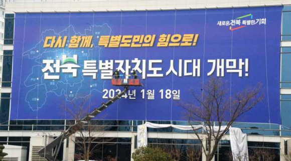 | 오는 18일 새로운 역사를 써나갈 전북특별자치도의 본격적인 출범을 앞두고 전북도청 공연장 한쪽 벽면에 ‘전북특별자치도 시대 개막을 알리는 현수막’이 걸리고 있다.<사진 제공=뉴시스> | 전북도 오는 18일 새로운 역사를 써 나갈 전북특별자치도의 준비를 모두 마치고 본격적인 출범 행사를 앞두고 있다. 도는 전북자치도 전환에 따라 행정기관에서 발급하는 각종 민원서류 등 행정정보 21건을 비롯해 중앙부처 286건, 도와 시군 자체 388건 등 모두 1,344건에 대한 시스템 정비에 나서 모의훈련을 거치는 등 단 1건의 오류도 발생하지 않도록 막바지 최종 점검에 총력을 기울이고 있다. 도는 또 도로와 문화재, 하천, 관광표지판 등 1만4천563건을 출범일 전까지 모두 교체 완료될 예정이다. 전북특별자치도 출범을 알리는 현수기도 전주역을 비롯해 전주한옥마을 등 도내 다중밀집장소를 중심으로 400여 조가 걸렸다. 이와 함께 전북자치도의 범국민 인지도 확산을 위한 온·오프라인 이벤트 진행 등 전방위적 홍보활동을 전개하며 분위기를 끌어올리고 있는 실정이다. 도는 출범 하루 전 도청 야외광장에서 도민 5천여 명이 참석해 ‘특별한 시작을 알리는 전야제’와 각 시·군에서도 ‘함께하는 시군 축하 행사’를 개최해 출범 분위기를 한껏 끌어올리기로 했다. 전야제에서는 출범 희망 메시지 사인 퍼포먼스와 함께 14개 시군과 도민들이 만든 플래시몹(Flash mob) 영상과 공연, 도청 외관을 스크린으로 삼은 미디어 파사드와 드론·레이저 쇼, 미디어 불꽃놀이 등이 펼쳐져 겨울밤을 화려하게 수놓을 예정이다. 출범식에서도 새롭게 개발한 전북특별자치도 음원과 율동을 활용한 도민들의 플래시몹 공연이 이어지며, 릴레이 응원 영상, LED 트론 퍼포먼스, 출범을 알리는 대북울림 퍼포먼스 등 다채로운 공연으로 자치도 출범을 축하한다. 출범식이 열리는 18일에는 한국소리문화의전당에서 도내·외 각계 인사를 비롯해 도민 2천여 명이 참석해 자치도의 첫걸음을 축하할 예정이다. 도는 출범 이후에도 김관영 도지사가 오는 25일부터 2월 2일까지 도내 7개 권역에서 직접 도민들에게 다가가 특별자치도에 대한 도민설명회를 개최하는 등 홍보활동과 자긍심 고취에 나선다는 방침이다.