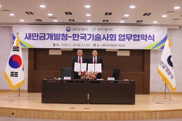 새만금개발청(청장 김경안)은 29일 새만금개발청 4층 대강당에서 한국기술사회(회장 장덕배)와 ‘새만금사업구역 안전문화 정착 및 기술협력을 위한 업무협약’을 체결했다고 밝혔다. <사진> 한국기술사회는 1965년에 설립돼, 2024년 현재 과학, 기술 분야 등 총 84개 종목, 5만8천여 명 기술사들을 대표하는 기관이다. 이날 협약식에는 김경안 새만금개발청장, 장덕배 한국기술사회 회장이 참석해 업무협약서에 직접 서명하고, 새만금사업의 주요 현안사업 추진을 위한 상호 협력방안 등도 논의했다. 이번 협약으로 새만금개발청과 한국기술사회는 새만금사업지역 안전문화정착을 위해 정보 및 자료 공유, 재난대응 컨설팅 지원 및 자문협력, 재난안전을 위한 조사 및 점검 등에 대한 기술을 지원한다. 특히, 새만금개발청은 현 정부 출범 이후 약 10조 원 규모의 투자유치를 달성하는 등 폭발적인 기업 입주가 집중되고 있고, 수변도시 및 3대 허브 산업(첨단전략산업, 글로벌 식품허브, 컨벤션허브) 추진 등 급격히 성장하고 있는 만큼 새만금개발 사업과 관련한 신기술 정보교류 및 기술적 자문 등에도 협력을 강화해 나가기로 했다. 김경안 새만금개발청장은 “모든 산업분야에서 최고의 기술을 발휘해온 기술사회와의 협력은 새만금사업이 안정적으로 추진될 수 있는 기반의 초석이 될 것”이라며 “오늘 협약을 시작으로 앞으로도 수변도시, 지역간 연결도로 사업 등에서 협력의 폭을 넓혀나가기를 기대한다” 고 말했다.
