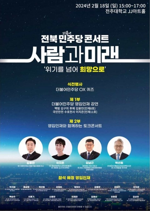더불어민주당 인재위원회(위원장 이재명)는 18일 오후 3시, 전주대학교 JJ아트홀에서 ‘위기를 넘어 희망으로, 전북특별자치도 더불어민주당 콘서트를 개최했다. 콘서트 1부는 김용만, 이지은 영입인재의 TED형식 강연, 2부는 김용만 이지은, 김남근, 박선원 영입인재가 함께하는 토크콘서트로 진행됐다. 이번 콘서트에는 박찬대 최고위원과 한병도 전북특별자치도당 위원장, 김윤덕(국회의원, 전주갑), 이원택(국회의원, 김제부안) 등 더불어민주당 주요 지도부가 참석했다. 한편 이번 콘서트는 지난 2월 1일 서울을 시작으로 4일 대전, 5일 광주, 14일 부산, 18일 전주에 이어 20일 대구, 21 청주, 25일 제주, 26일 원주, 29일 부천 등 총 10회의 전국 투어로 진행되며, 더불어민주당 유튜브 채널인 ‘델리민주’를 통해서 모두 생중계됐다. |