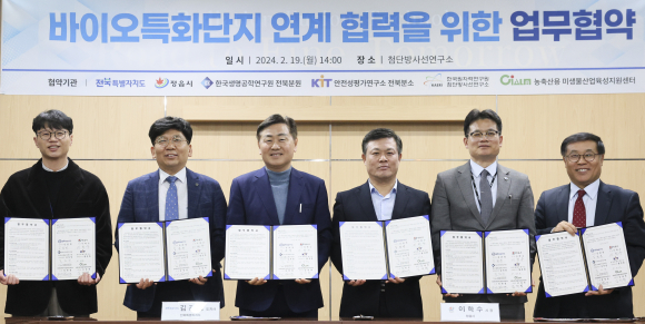 | 김관영 도지사는가 19일 정읍에 집적된 농축산용미생물산업육성지원센터를 비롯한 4개 연구기관과 바이오 특화단지 유치를 위한 ‘협력체계 구축 업무협약’을 갖고 있다.<사진 제공=전북자치도청> |