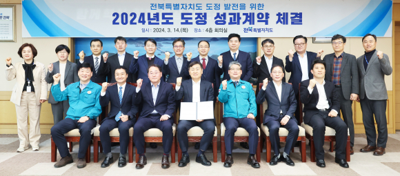 | 김관영 전북특별자치도지사를 비롯한 실·국장들이 14일 ‘2024년 도정 성과 계약식’에서 도정 성과계약을 체결한 후 성과향상을 다짐하며 기념촬영을 하고 있다.<사진 제공=전북자치도청> | 전북특별자치도는 4급이상 국·과장급 공무원 112명 모두가 민선 8기 도정 발전을 위한 각각의 과제와 목표를 설정하고, 이에 따른 성과 달성과 책임행정을 강화하기 위해 2024년 도정 성과계약을 체결했다고 14일 밝혔다. 성과계약은 매년 국·과장급 공무원이 당해연도 추진해야 하는 개인목표를 설정하고 도지사 등과 계약을 체결하는 등 성과향상을 다짐해 오고 있다. 2024년 도정 성과계약 과제는 총 397건으로 국장급 21명에 대한 113건, 과장급 91명에 대한 284건이며, 이 가운데 공약사업 83건, 정부합동평가 64건, 전북특별법 특례 실행 62건 등을 과제로 반영, 추진하기로 했다. 특히 올해는 전북특별법 특례 실행을 위해 각각의 특례에 대한 지표와 과제에 대한 전문가 컨설팅을 통해 62건의 신규 목표를 추가했다. 이번 계약은 민선8기 핵심전략인 ①전북 도민경제 부흥 ②농생명 산업수도 ③문화·체육·관광 산업거점 조성 ④새만금 도약·균형발전 ⑤도민행복·희망교육 등 5대 목표를 기본방향으로 정했다. 주요 계약 과제는 ▲2025년 국가예산 9조 5,000억 원 확보 ▲500억 원 이상 대형 국책사업 발굴 ▲위험요소 선제적 발굴·해소를 통한 재난·안전사고 발생 최소화 ▲지역 특수성을 반영한 2단계 전북형 특례 발굴 ▲문화콘텐츠산업 육성 ▲힐링생태 거점기반 확대 등 에코힐링 1번지 조성 ▲미래성장동력산업 핵심 기업 유치 ▲글로벌 생명경제도시로 전환을 위한 특례 실행방안 강화 ▲농생명산업지구 지정 및 운영 추진 ▲지역 연계·협력을 통한 지역주도형 교육발전 모델 발굴 ▲ 새만금유역 3단계 수질개선대책 세부실행계획 추진 등을 설정했다. 김관영 전북특별자치도지사는 “올해는 전북특별자치도 원년의 해인 만큼 도정 각 분야에서 도민들께서 차별성 있고 완성도 높은 정책을 체감하실 수 있도록 간부 공무원부터 다시 한번 각오를 가다듬어야 할 중요한 시기”라고 강조했다. 그러면서 “이번에 체결하는 성과계약 과제 어느 한 과제도 소홀히 해서는 안되는 도민과의 약속임을 명심해야 한다”며 “막중한 책임감을 갖고 추진에 만전을 기하도록 해달라”고 당부했다.