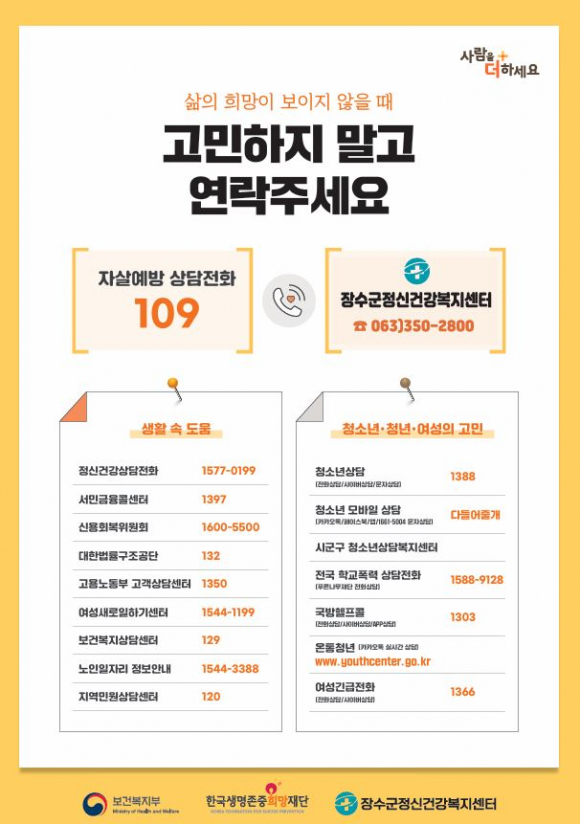 장수군정신건강복지센터는 오는 5월까지 봄철 자살고위험시기 자살예방 집중관리를 실시한다. 통계에 따르면 봄철 자살률 증가는 세계적으로 공통된 현상으로 봄철 일조량 증가, 꽃가루, 미세먼지 등 계절적 요인과 졸업‧구직 시기 등 다양한 요인이 작용하는 것으로 추정된다. 이에 정신건강복지센터는 등록 관리 중인 자살 고위험군에 대해 사례관리를 강화하고 안부 문자 발송과 전화상담 등 집중 관리를 실시할 계획이다. 또한 유동 인구가 많은 공공기관 및 군민의 생활 밀착시설에 상담전화번호 안내 포스터를 게시해 자살 고위험군을 적극 발굴할 예정이다. 박애순 보건사업과장은 “자살고위험시기 집중 관리를 통해 자살고위험군 발굴과 예방에 최선을 다하겠다”고 말했다. 자살예방 및 정신건강 상담은 자살예방 상담전화(109) 또는 장수군 정신건강복지센터(350-2800)로 문의하면 도움받을 수 있다. |