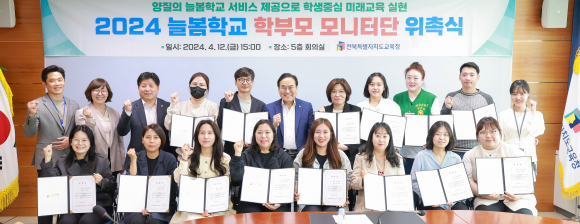 전북특별자치도교육청(서거석 교육감)은 ‘전북 늘봄학교 학부모 모니터단 위촉식 및 워크숍’을 12일 도교육청 5층 회의실에서 개최했다. 이날 행사는 초등 1~2학년 학부모로 구성된 늘봄학교 학부모 모니터단을 대상으로 전북형 늘봄학교 정책 이해 연수와 모니터단의 역할에 대해 안내하고자 마련됐다. 학부모 모니터단은 전북교육청 미래교육과 누리집 방과후·늘봄지원센터 내에 모니터단 코너를 통해 수시로 모니터링 결과를 공유하고, 분기별로 오프라인 정기 협의회를 실시한다. 아울러 질 높은 늘봄 프로그램 발굴과 우수사례 확장, 늘봄학교 정책 아이디어 제안 및 인식 조사 등을 실시한다. 전북교육청은 모니터링 결과를 분석후 늘봄학교 정책 수립 시 반영할 예정이다. 서거석 교육감은 모니터단에서 위촉장을 수여한 뒤 “늘봄학교 학부모 모니터단의 적극적인 현장 의견 청취와 정책 제언 등을 통해 늘봄학교가 현장에 안착될 수 있도록 하겠다”며 “학부모와 학교 현장의 의견 수렴을 통해 안전한 돌봄 환경을 구축하고, 지자체 및 지역사회와 적극적으로 연계하는 늘봄학교 정책을 추진하겠다”고 말했다. |