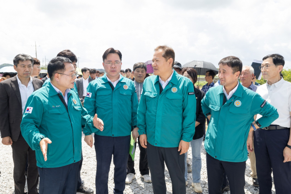 | ↑↑ 정헌율 익산시장이 수해지역을 방문한 이상민 행정안전부 장관에게 수해현황을 설명하고 있다. |