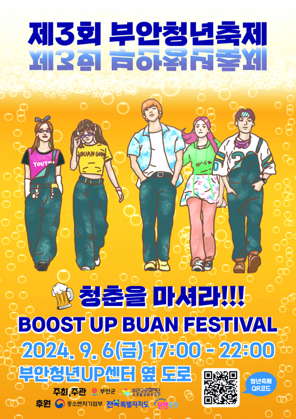 2024년 제3회 부안 청년축제가 9월 6일 17시부터~22시까지 부안청년UP센터옆 도로에서 개최된다. 부안군과 부안상권활성화추진단이 주최·주관하는 이번 행사는 청년이 주인공이 되는 축제답게 공개모집을 통해 선정된 청년공연팀과 서포터즈가 다수 참여하여 끼를 뽐낼 예정이다. 또한 공연과 함께 즐길 수 있는 시원한 맥주와 다양한 먹거리가 준비되어 있으며, 축제 만족도조사에 참여하면 간식쿠폰을 받을 수 있다. 이외에도 청년들이 운영하는 체험부스에서 파티메이크업 등 색다른 경험을 해볼 수 있을 뿐만 아니라 행사 후반에는 축제의 열기를 더할 EDM 공연과 초청가수 공연이 준비되어 있다. 작년과 다르게 올해는 친환경 축제를 위해 일회용품 대신 방문객에게 다회용기를 대여하며, 사용한 다회용기는 방문객이 직접 다회용기 반납부스에 반납하면 된다. 또한 텀블러를 지참한 방문객에게는 맥주쿠폰을 지급할 예정이다. 입장 시에는 사고예방을 위해 소지품검사가 진행될 예정으로, 외부음식은 반입이 금지된다. 맥주를 구입하고자 하는 방문객은 사전에 성인인증 부스에서 신분증 검사 후 성인인증팔찌를 받아야 맥주부스를 이용할 수 있다. 한편 교통 혼잡 및 음주운전 방지를 위해 축제장을 찾는 방문객들은 가능한 도보를 이용할 것을 권고한다. |