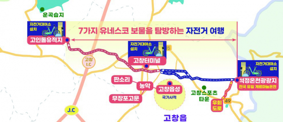 고창군은 국비 5억원을 포함 총사업비 15억원을 투입해 7가지 유네스코 보물을 탐방하는 자전거 노선을 구축한다.