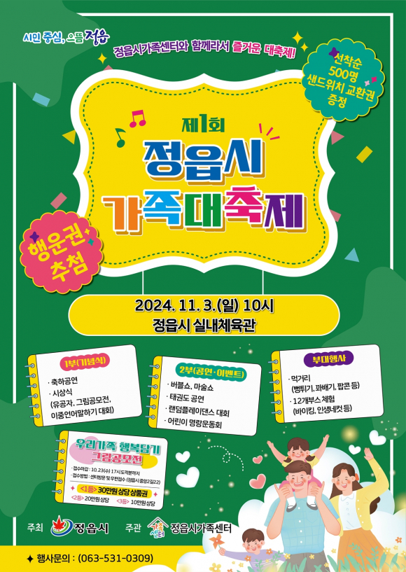정읍시가 오는 11월 3일 정읍체육관에서 ‘제1회 정읍시 가족대축제’를 개최한다. 이 축제는 기존 다문가족을 위한 행사에서 나아가, 모든 형태의 가족이 참여해 화합을 이루는 대축제로 확장됐다. 이번 행사는 가족 친화적 분위기를 조성하며 서로의 문화를 이해하고 즐길 수 있는 다양한 프로그램을 마련해 소통과 화합의 장을 제공한다. 심리검사나 MBTI, 타로 등 재미있는 가족 심리 프로그램부터 가족 중심 체험부스까지 다채로운 내용으로 구성됐다. 축제는 1부와 2부로 나뉘어 진행된다. 1부에서는 가족센터 다문화 밴드와 줌바댄스 팀의 공연을 시작으로 세계 각국의 의상 체험과 소품 만들기, 인생네컷 촬영 등 가족과 함께 즐길 수 있는 프로그램이 마련된다. 2부에는 버블쇼, 마술쇼, 태권도 공연 등 흥미진진한 공연과 어린이 명랑운동회가 이어져 시민 모두가 참여하고 즐길 수 있는 시간으로 꾸며질 예정이다. 또한, 행사장에서는 꽈배기와 음료 등 간식이 무료로 제공되며, 가족의 행복을 주제로 한 작품 전시, 바이킹 체험 등도 준비된다.