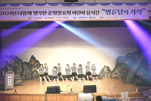 장수군은 지난 9일 한누리전당 소공연장에서 ‘2024년 다함께 행복한 문화발표회’를 성황리에 개최했다고 밝혔다. 장수군 가족센터(법인 전북특별자치도사회서비스원)가 주관한 이번 문화발표회는 최훈식 군수, 최한주 군의회의장, 박용근 도의원 및 일반가정, 다문화가정 등 200여 명이 참석한 가운데 댄스, 발레, 라인댄스, 기타, 줌바댄스, 음악 동호회 공연 및 어린이 뮤지컬 ‘명륜당의 기적’ 등 지역주민 누구나 즐길 수 있는 다채로운 프로그램으로 진행됐다. 특히 어린이 뮤지컬 ‘명륜당의 기적’은 장수군의 지역 문화유산을 활용한 창작 뮤지컬로 문화교육의 기회가 적은 지역 내 아동청소년들이 연기, 노래, 안무, 연출에 직접 참여하도록 해 문화 체험의 기회를 제공했다. 또한 미취학 아동들의 건강한 신체적, 정서적 성장지원에 도움을 주는 키즈발레도 올해는 ‘한국마사회 장수목장 공모사업’에 선정되며 참여 대상을 확대했다. 오인철 장수군가족센터장은 “올해 ‘월드비전 이주배경 아동청소년지원 공모사업’에 선정된 것이 아동청소년들이 꿈과 재능을 갈고닦을 수 있도록 물심양면으로 지원할 수 있는 계기가 됐다”며, “앞으로도 여러 가족들이 함께 어우러지는 프로그램들을 운영해 다양성과 포용의 사회문화 조성을 위해 힘쓸 예정이다”고 말했다. 최훈식 군수는 “이번 다함께 행복한 문화발표회를 통해 다양한 문화 배경을 가진 가족들이 함께하는 포용성 넓은 사회가 되길 바란다”며, “군에서도 다양한 가정의 아이들이 건강하고 행복하게 성장할 수 있도록 최선을 다하겠다”고 전했다. |