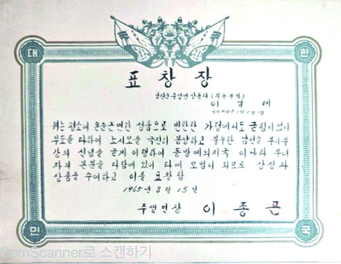표창장(주생면장상) 남원군 주생면 상동리 (부동부락) 이 남 례 서기 1928년 1월 1일생 위는 평소에 온순 근면한 성품으로 빈한한 가정에서도 굽힘이 없이 부도(婦道)를 다하여 노시모를 극진히 봉양하고 불우한 남편을 부위부강(夫爲婦綱)의 본분을 다함에 있어 타(他)의 모범이 되므로 상장과 상품을 수여하고 이를 표창함 1965년 8월 15일: 주생면장 이종곤