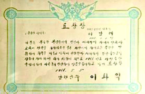 표창장(남원군수상) (훌륭한 어머니) 남원군 주생면 상동리 이 남 례 1928. 1. 1 생 이 분은 불우한 환경 속에서 빈곤과 싸워가며 자녀의 양육과 교육에 전력을 다하였음은 물론 가정에서 자애로운 부덕(婦德)을 발휘하여 화목을 이루고 사회에 공헌한 바 지대하여 인근 주민들의 칭송이 자자하여 타의 귀감이 되므로 1966년도에 가정주간을 맞이하여 이를 높이 찬양하며 상품을 수여하고 이에 표창함 2966.5.5 –남원군수상(1966.5.5.)