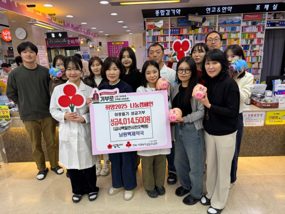 남원시는 12월 17일 남원백제약국(대표 : 유은상)이 약국 내에 비치한 저금통 모금액 4백여만 원을 남원시에 기부했다고 밝혔다. 이 금액은 약국을 찾는 시민들이 1년 동안 십시일반으로 모은 성금으로, 지역사회를 위한 나눔 문화 확산에 큰 의미를 더하고 있다.
