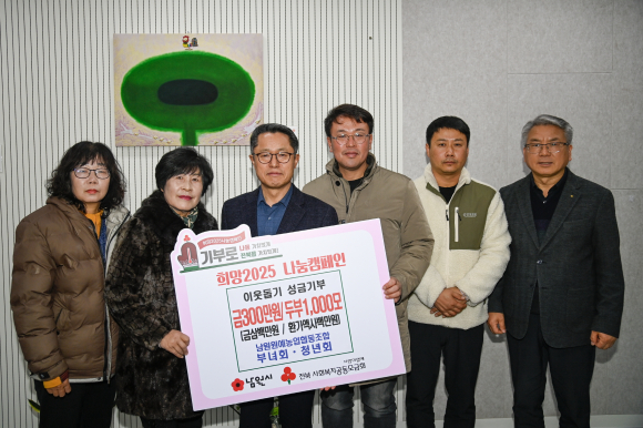 남원시는 12월 20일 남원원예농업협동조합(조합장 김용현)이 희망2025나눔캠페인을 맞아 성금 300만 원과 두부 1천 모를 기부했다고 밝혔다. 이번 기부는 남원원예농협 부녀회와 청년회의 주도로 이뤄졌다. 부녀회는 성금 3백만 원을 마련했으며, 청년회는 남원에서 생산한 100% 국내산 논콩으로 만든 두부 1천 모를 지역 내 사회복지시설에 전달하기 위해 준비했다.